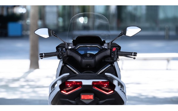 Modely MAX jsou proslulé mimořádně pohodlnou jízdou a model XMAX 125 Tech MAX+ je vybaven elektronicky nastavitelným štítem, který poskytuje účinnou ochranu proti větru. Tento štít lze zvedat a spouštět v rozsahu 95 mm stisknutím přepínače na levém řídítku, aby vyhovoval různým jízdním stylům a různým typům postavy. Integrované blikače jsou také navrženy tak, aby poskytovaly účinnou ochranu rukou jezdce před větrem, a kapotáž a spoiler pomáhají eliminovat boční nárazy větru. Ovládání je jednoduché a můžete nastavit štít za jízdy bez nutnosti zastavovat. Díky této praktické funkci si můžete přizpůsobit ochranu před větrem podle aktuálních podmínek a vašich preferencí, ať už jedete po městě nebo na dálnici.