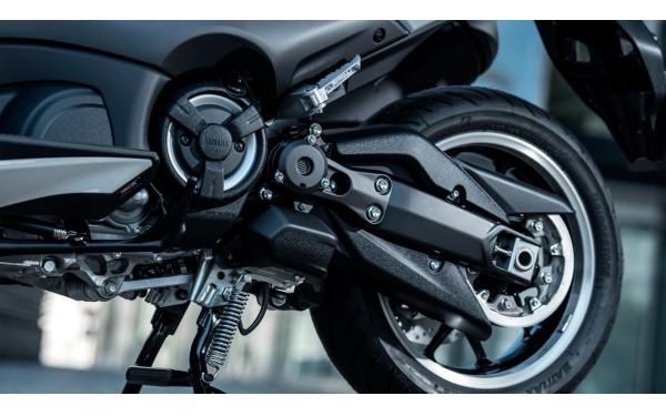 TMAX Tech MAX od samého počátku udává směr v návrhu šasi sportovních skútrů. Aby byla zajištěna optimální pevnost šasi a přesné ovládání, je motor o objemu 560 cm³ uložen přímo v lehkém rámu z hliníku litého pod tlakem s dvojitým nosníkem. Pokročilejší technologie odvozené od motocyklu se projevují použitím dlouhé hliníkové kyvné vidlice a nastavitelného odpružení, které významně přispívají ke stabilitě ve vysokých rychlostech. Tento rám poskytuje ideální rovnováhu mezi pevností a hmotností, což se projevuje ve vynikající ovladatelnosti a jízdních vlastnostech. Cítíte každý pohyb a máte plnou kontrolu nad svým strojem. Hliníková konstrukce nejen snižuje celkovou hmotnost skútru, ale také zvyšuje jeho tuhost, což se pozitivně projevuje na přesnosti řízení a stabilitě při průjezdu zatáčkami. Nastavitelné odpružení vám umožní přizpůsobit jízdní vlastnosti podle vašich preferencí, zatížení a typu silnice.